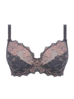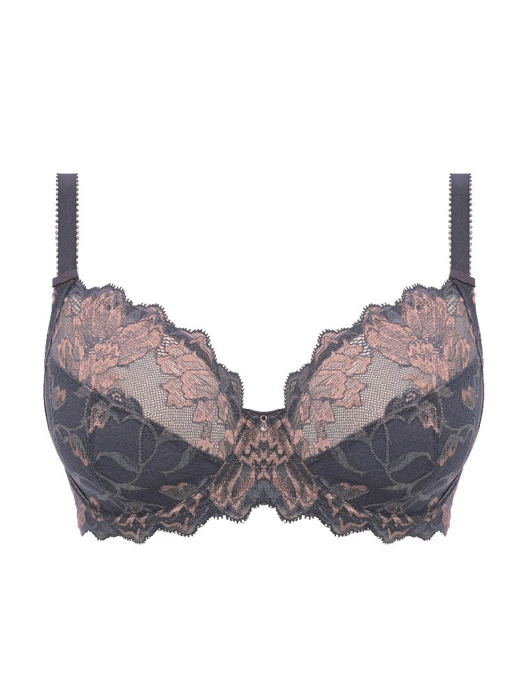 The Aubree Side Support bra in Shadow Rose, featuring a three piece cup for excellent uplift and forward projection. The cups are adorned with a gorgeous floral lace. Finished with a diamante charm at the centre.