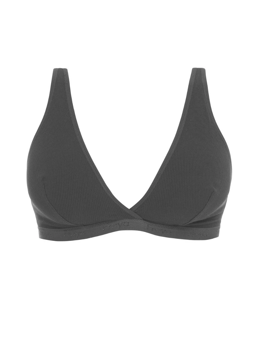 This soft triangle-shaped bralette features a super soft handle ribbed fabric with a powermesh inner layer for extra breathability, and a flat elastic underband for anchorage and support. Straps are fixed, with a hook-and-eye closure at the back – perfect for hot summer days! (And nights…?)