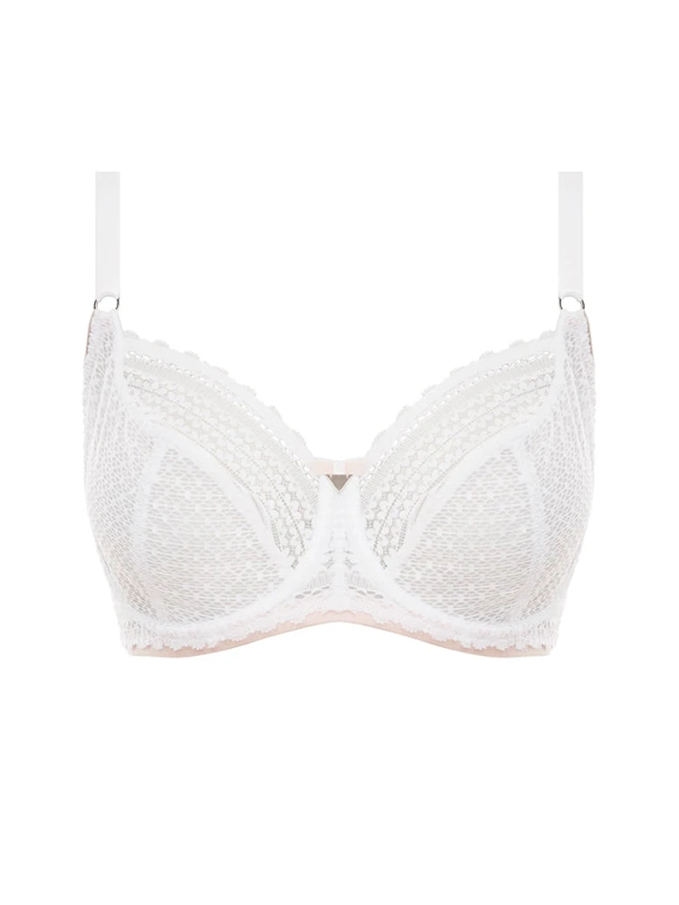 Freya Daisy Lace Balcony bra in colour White is a perfect bra for everyday comfort. This charming non-padded bra features 3-section cups which provides support, uplift and a natural shape to the bust. The bra boasts a stunning geometric lace with adjustable satin straps and a cute satin bow in the centre. A romantically chic bra which is perfect for your everyday lingerie collection!