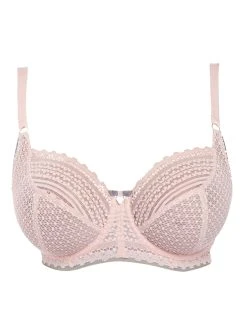 Freya Daisy Lace Balcony bra up to a K cup in colour Blush. This bra provides a deeper wire for great coverage, support and comfort. The lined bottom cup also adds support and shape. Its lace top cup has stretch lace for ease of fit. Finished with a cute bow and silver triangle embellishment.