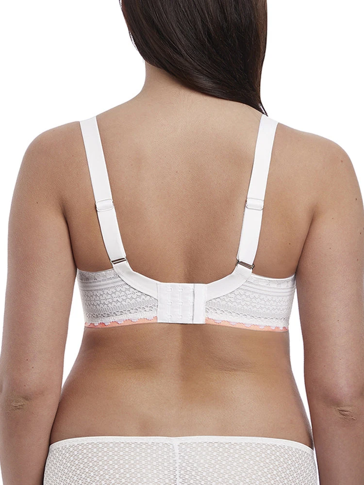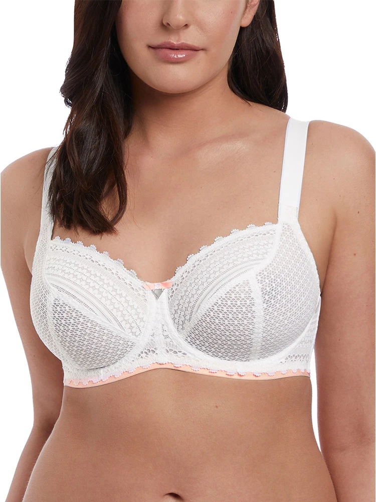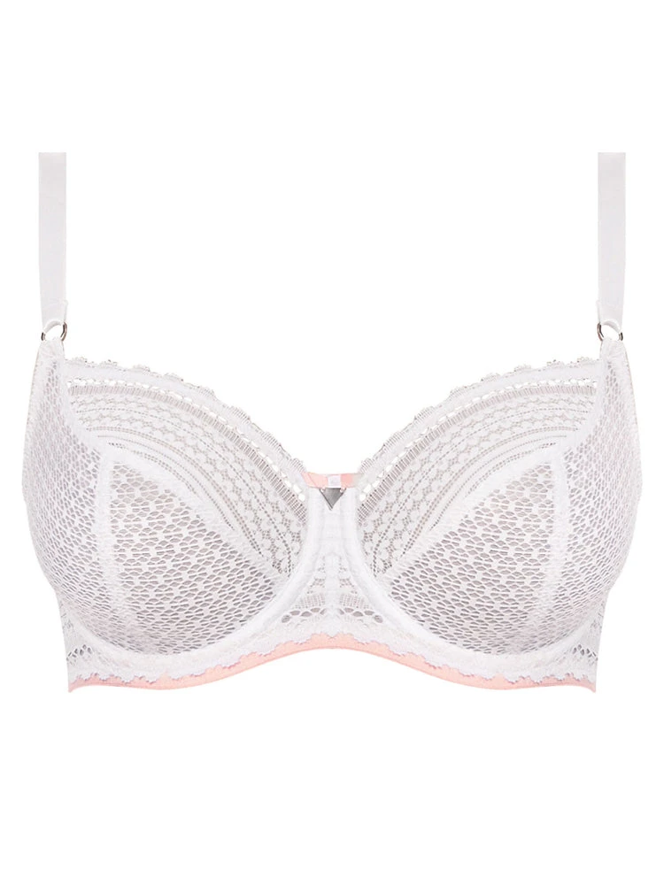 Freya Daisy Lace Balcony bra up to a K cup in colour White. This bra provides a deeper wire for great coverage, support and comfort. The lined bottom cup also adds support and shape. Its lace top cup has stretch lace for ease of fit. Finished with a cute bow and silver triangle embellishment.