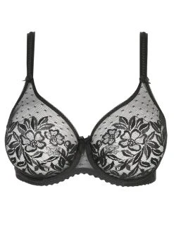 Primadonna Divine, this gorgeous underwired full cup bra features sheer lace seamless cups for a sexy and captivating look. The cups are preformed and help to centre and support your bust for a flattering fit. It’s wide side wings offer extra comfort, whilst the adjustable straps help with the ease of fit. Featuring a stunning French lace with a floral print and complete with 3 cute bows on the centre of the cups and straps.