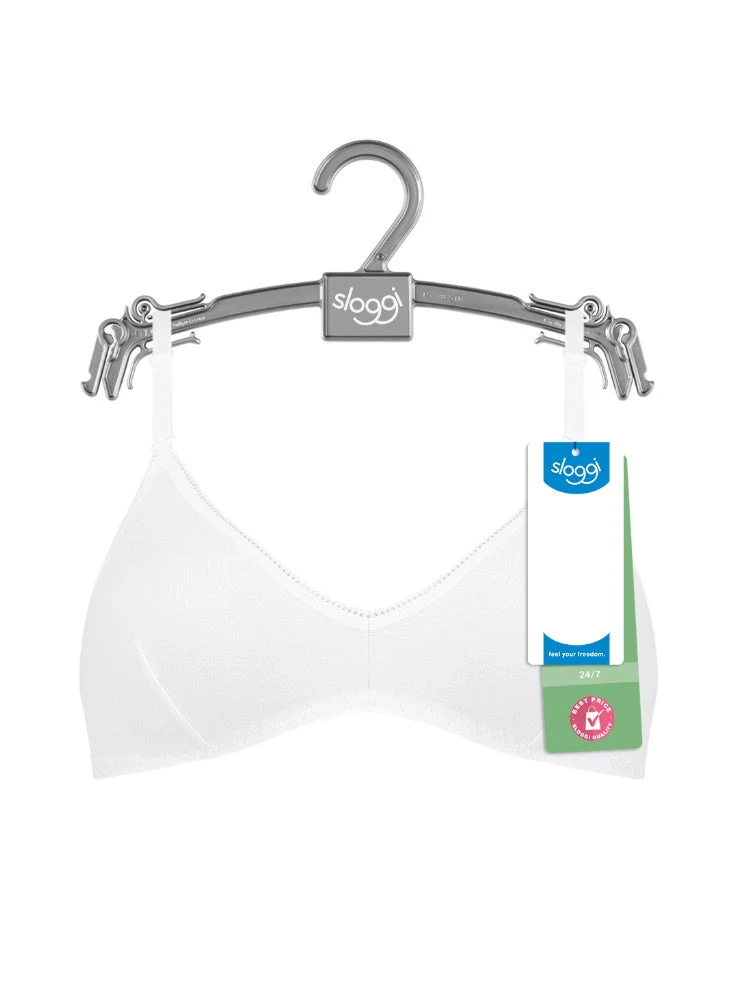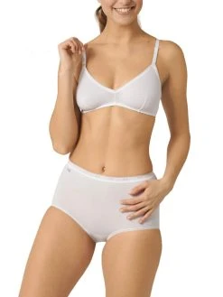 This 24/7 Cotton Soft Cup Bra from Sloggi guarantees true comfort and quality, all day long. This soft cup bralette, made from soft jersey, has a high cotton count and will feel super smooth on your skin. Pair with the Cotton Midi or the Cotton Maxi for ultimate comfort. Available in White.